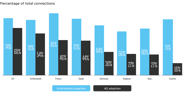 L’Europe a pris du retard dans le déploiement du forfait 4G. La France ne fait pas exception à la règle même si les français ne sont pas si mal lotis par rapport à leurs voisins européens. En effet, selon le rapport 2017 de GSMA Intelligence sur l’économie mobile, la France fait partie du trio de tête en terme de part de connexions internet effectuées en 4G sur le réseau mobile. Cette part s’élève à 46%. La France est néanmoins devancée par le Royaume-Uni (60%) et les Pays-Bas (54%).