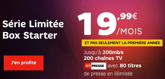 Besoin d’une promo box internet pour réaliser quelques économies ? Jusqu’au 20 novembre 2017, la box Starter SFR est au prix de 19,99€ par mois à vie. Jusqu’à maintenant ce tarif de 19,99€/mois n’était valable que les 12 premiers mois et le prix standard de 34,99€/mois était appliqué par la suite. A ces prix, il est nécessaire d’ajouter le prix de la location de la box internet, soit 5 euros par mois.